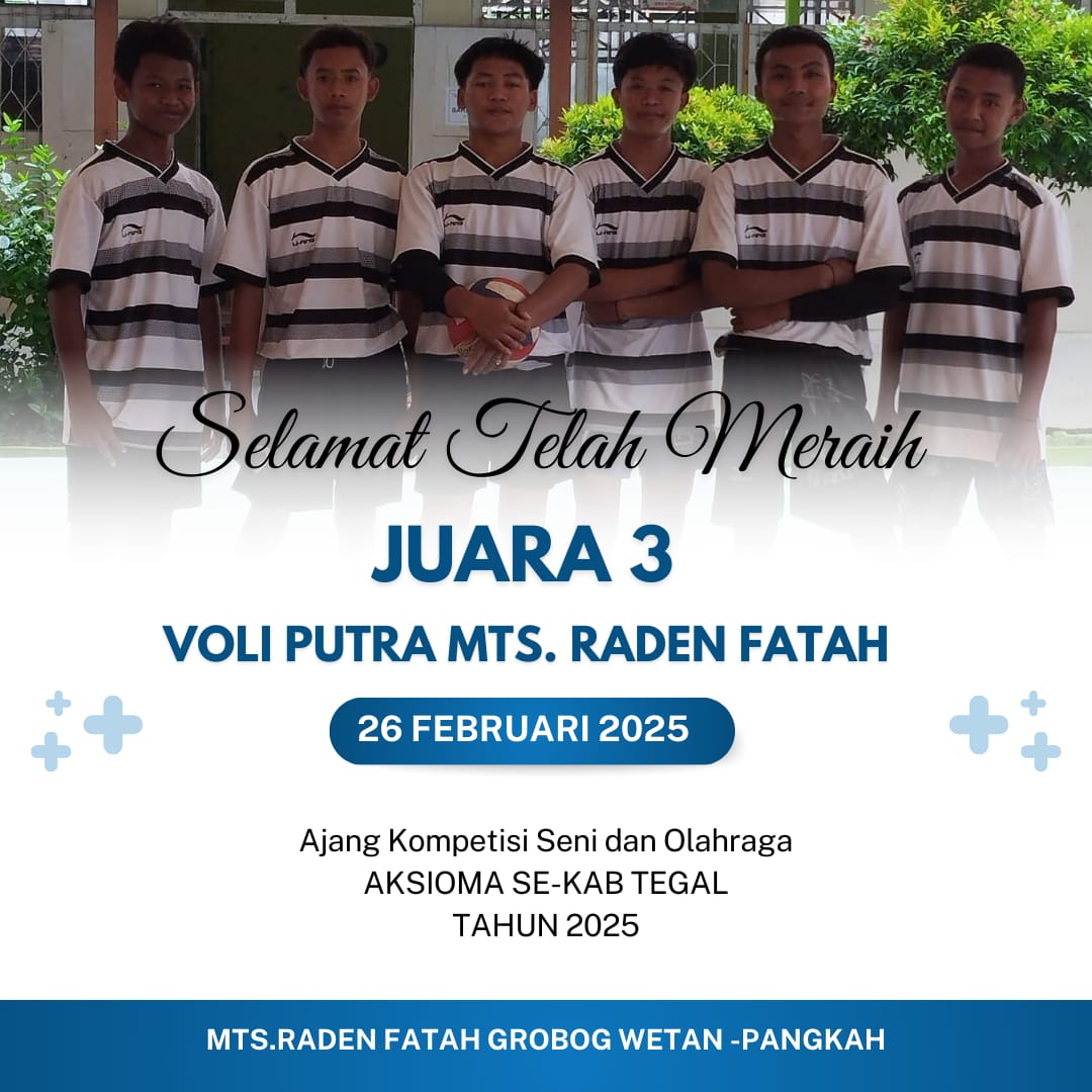 Dalam pertandingan bola voli putra, tim MTs Raden Fatah berhasil meraih prestasi membanggakan dengan menempati posisi juara 3. Keberhasilan ini menjadi bukti kerja keras dan semangat juang para atlet muda madrasah dalam menghadapi kompetisi yang ketat dan penuh tantangan.